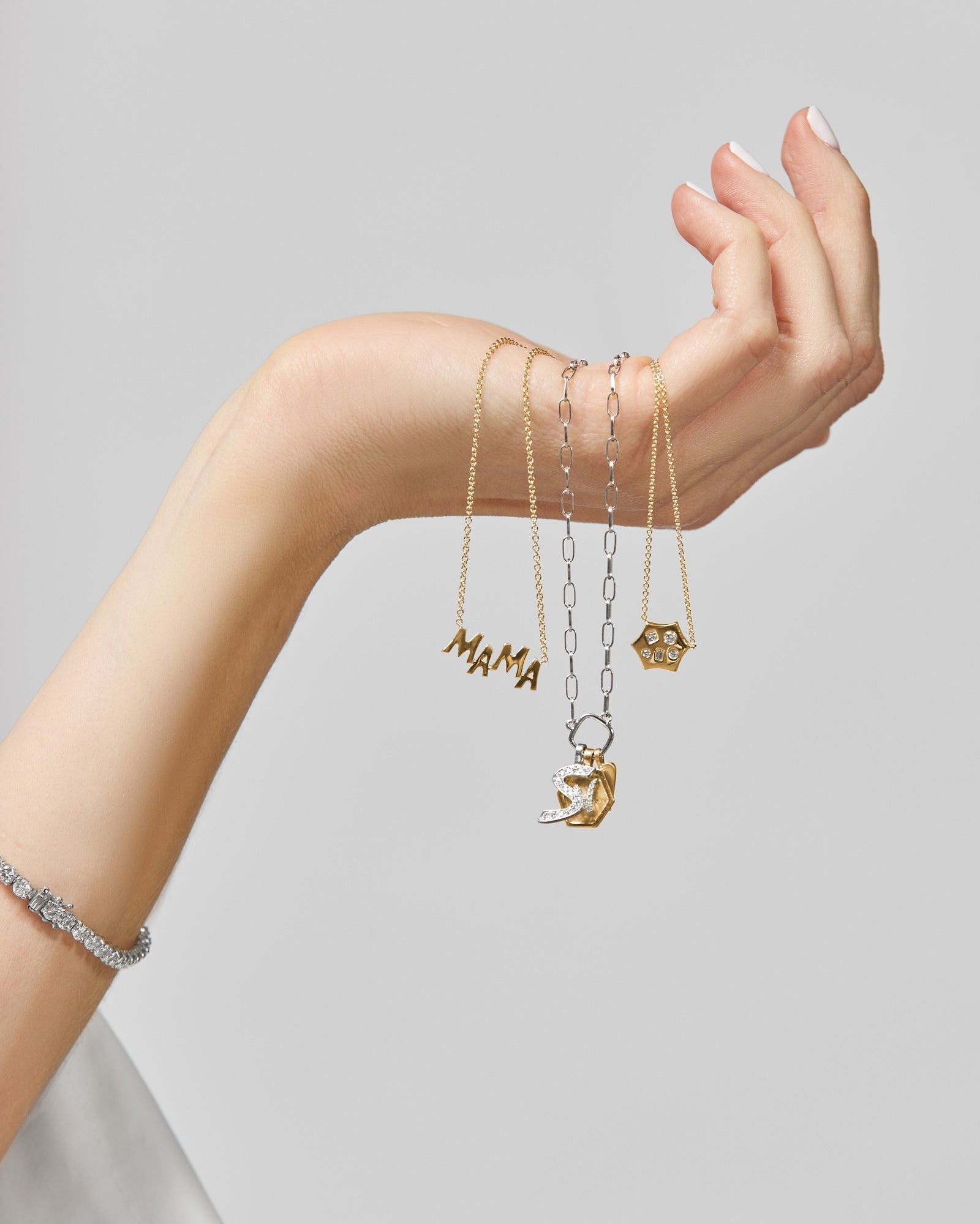 18kt yellow gold Our Favorite Daughter Speech Bubble pendant with 5 flush set diamonds - round, princess and emerald cut - with a total approx. weight of .21cts.