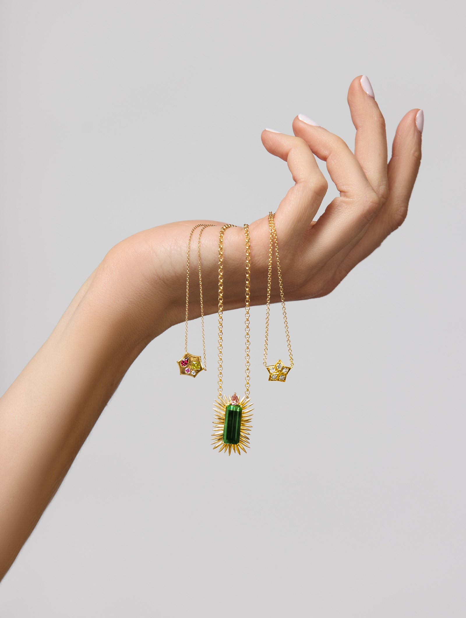 18kt yellow gold Our Favorite Daughter Bubble necklace set with a small round diamond, princess cut yellow sapphire, pear shape rhodolite and small round pink sapphire.