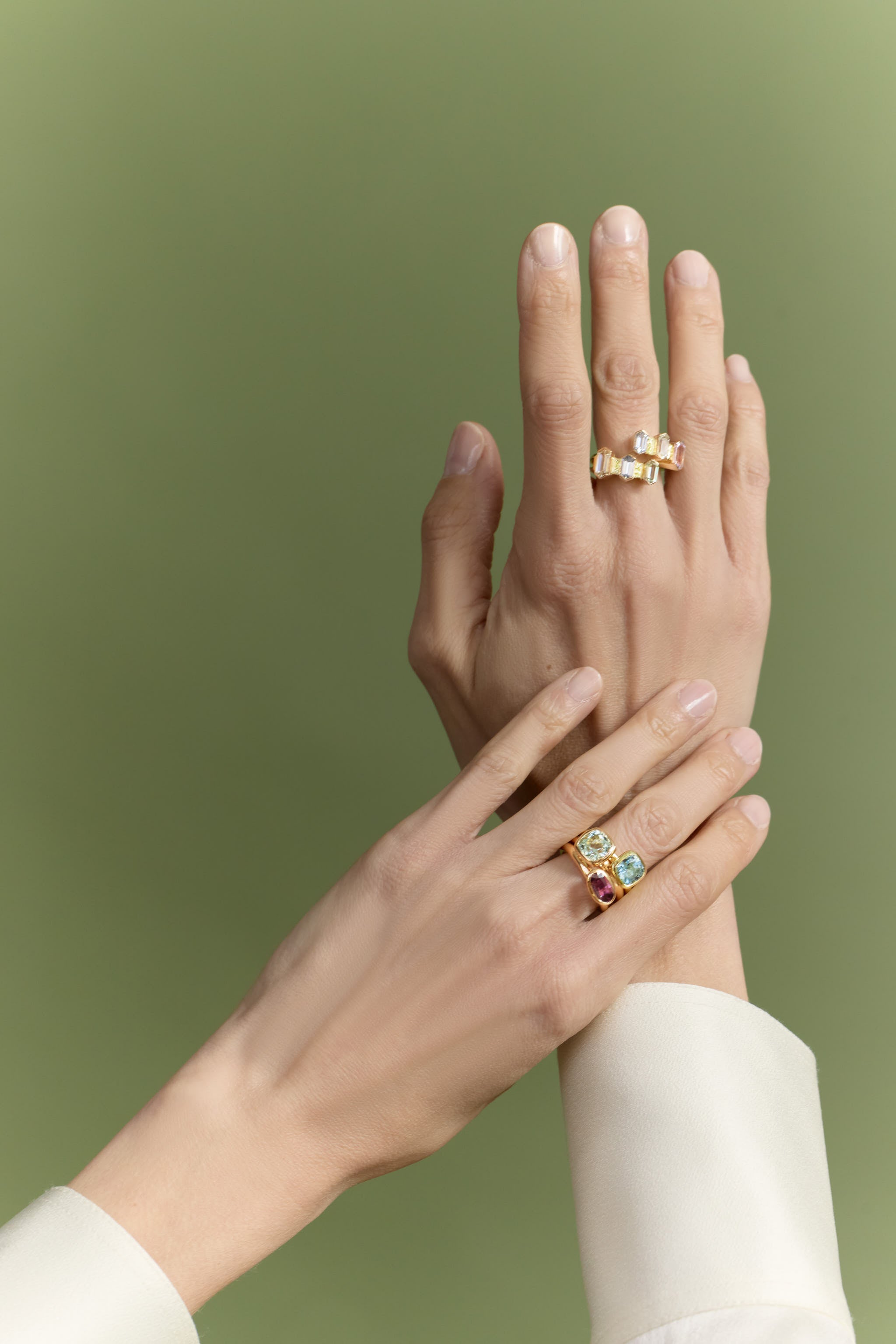 18kt rose and yellow gold one of a kind pastel sapphire and yellow diamond wrap ring. The 6 fancy cut sapphires have a total weight of 3.67cts varying in color with .32cts of yellow diamonds set in between.
