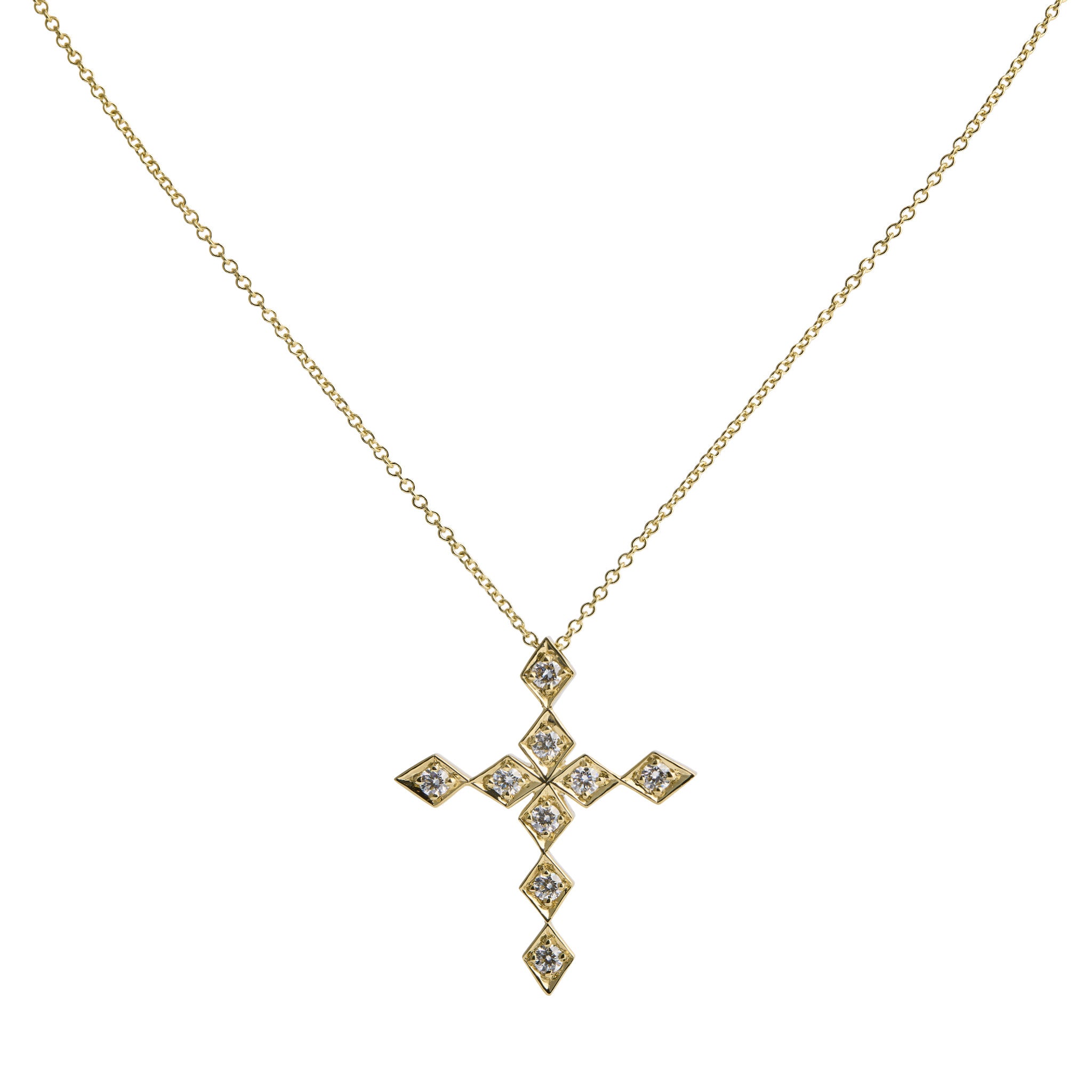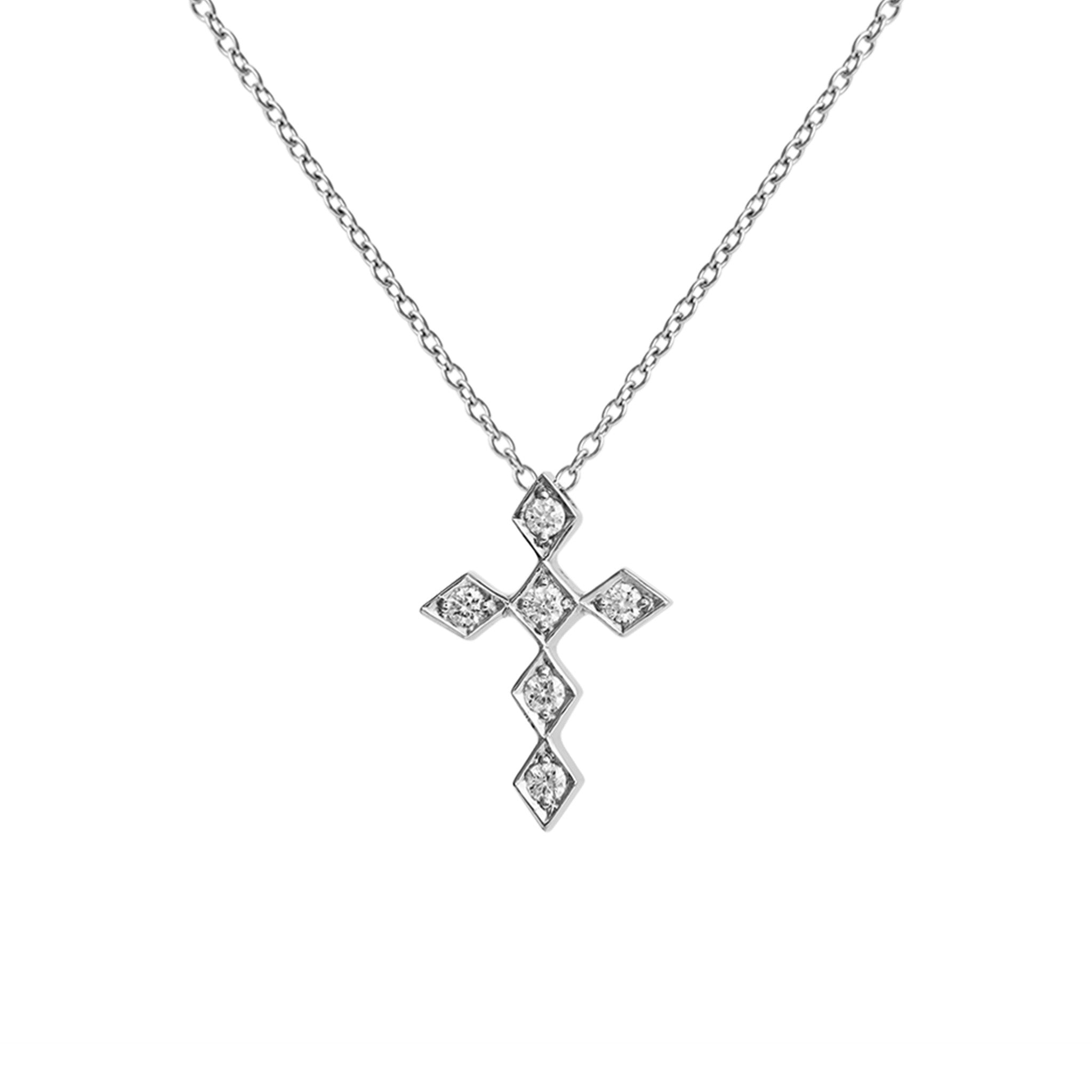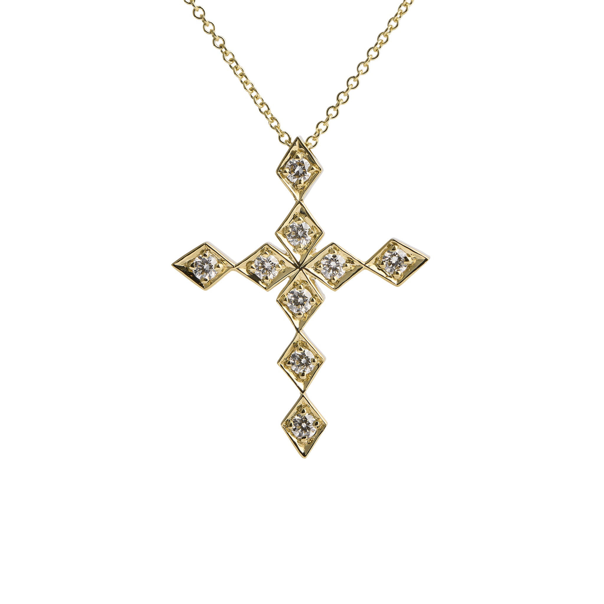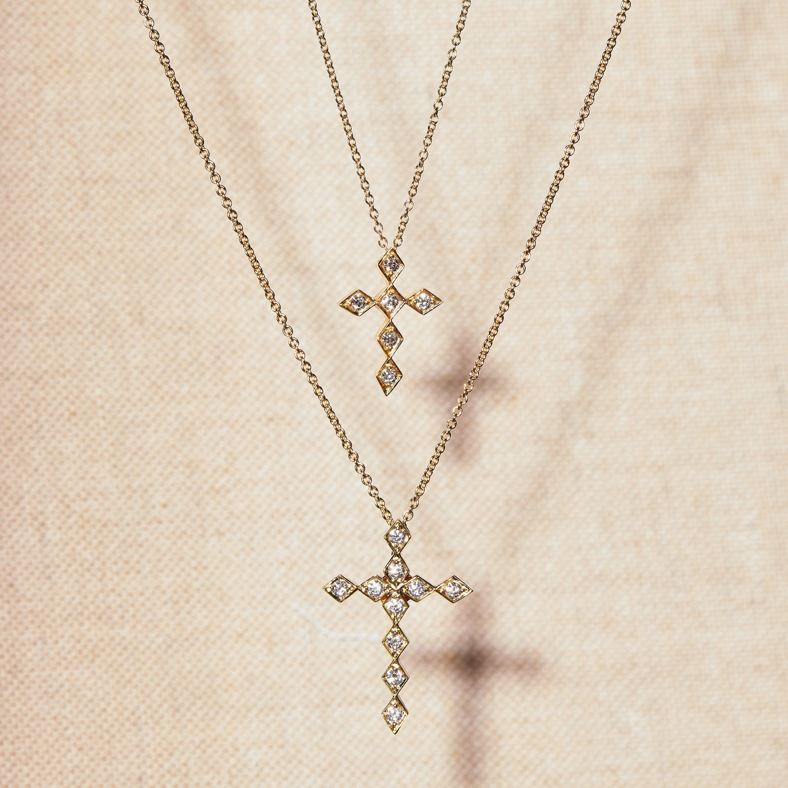 18kt Romeo cross set with diamonds on a pendant chain. Available in 18kt yellow, rose and white gold.
